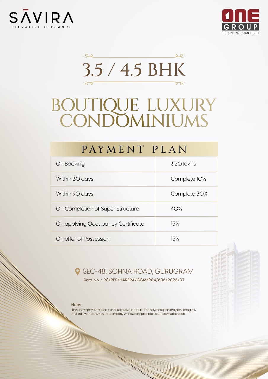 Welcome to The Saavira, a 7-star inspired ultra-luxury Singapore-style residential high-rise by One Group, crafted for those who demand only the finest. Rising gracefully in Sector 48, Gurgaon, The Saavira blends architectural brilliance with unmatched exclusivity, offering a lifestyle that redefines modern living.
